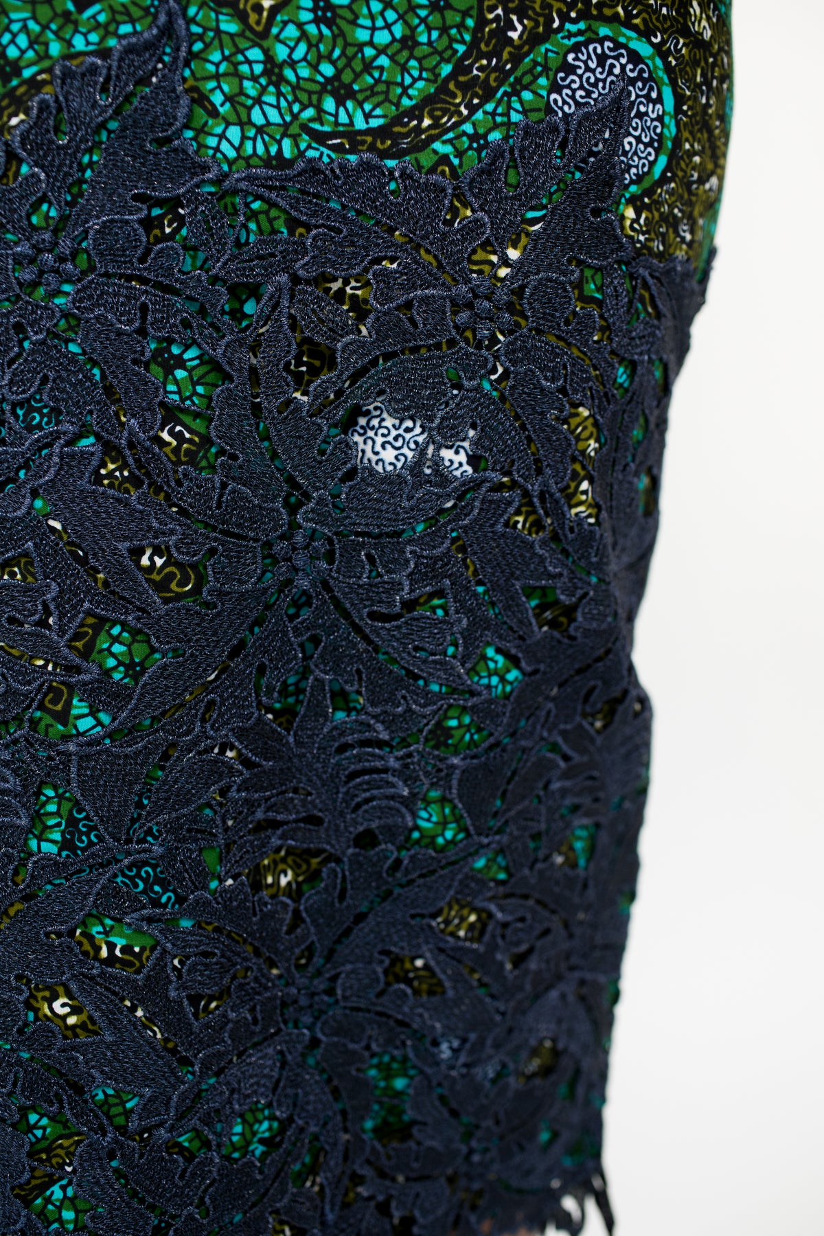 Grace Lace Skirt is a study in grace and craftsmanship-part of Yaa Chic’s signature Peplum Top. Handcrafted in Ghana, this midi skirt layers rich navy lace over luminous emerald and navy print creating texture, depth, and quiet opulence.